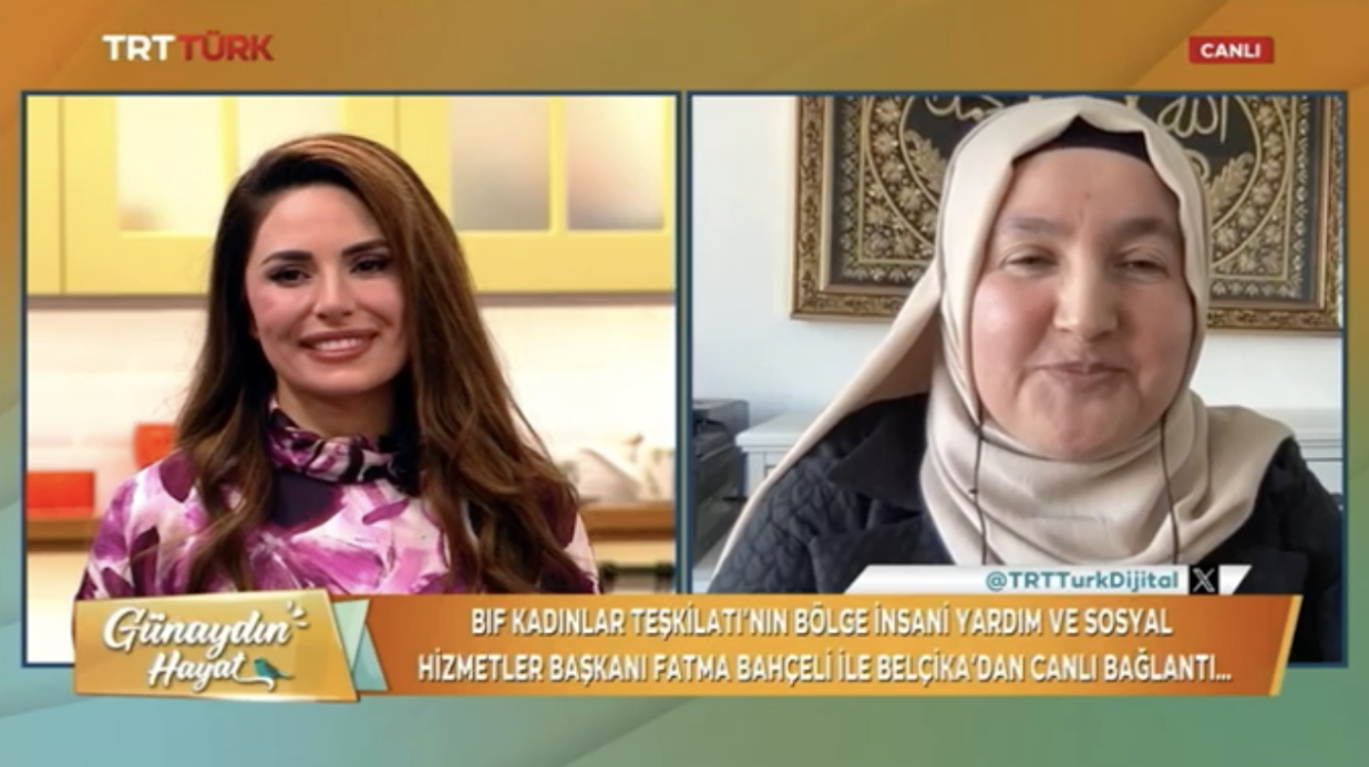 • BİF KT İYSH Başkanımız Fatma Bahçeli bugün TRT Türk kanalında yayınlanan 'Günaydın Hayat' programına bağlandı. Programda 'Muhabbet Örüyoruz' projesi hakkında “Belçika İslam Federasyonu Kadınlar Teşkilatı olarak, İnsanî Yardım ve Sosyal Hizmetler birimimizin projesi olan Muhabbet Örüyoruz ile hem muhabbetimizi hem birlikteliğimizi güçlendiriyoruz. Bu çalışmayı araç olarak kullanarak, huzurevlerini ve yetimhaneleri ziyaret ediyoruz ve el emeği göz nuru ile ördüğümüz örgüleri hediye ediyoruz. Bu şekilde, insanlık müştereklerimizi bir kez daha güçlendiriyoruz.” şeklinde izleyenleri bilgilendirdi.